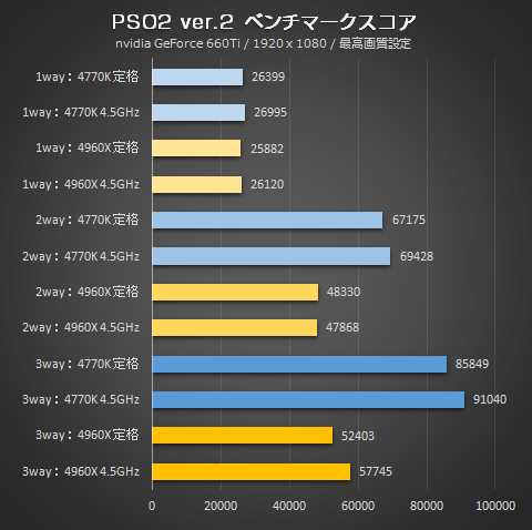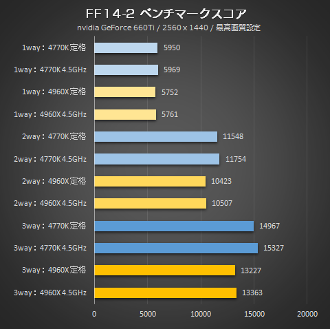 4960Xの3way時のスコアを4770Kの2way時のスコアがぶっちぎるという、よく解らない結果となっております。
