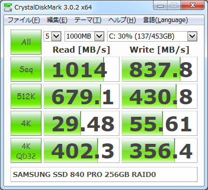 CPUの性能とは異なりますが、ハイエンドパーツでハイエンドな構成を、ということでストレージもSAMSUNG SSD840 Pro 256GB×2のRAID0構成で強化してみました。