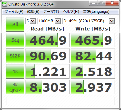 データが半分くらい埋まっている状態なのでベストな結果ではありませんが、それでもシーケンシャルで465MB/sとSSD並の速度をたたき出しています。