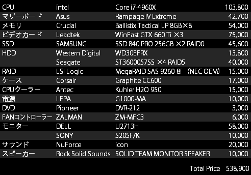 メインストレージはSATA3対応SSDのRAID0構成、HDDは15,000rpmを誇るエンタープライズ向けHDDのRAID5構成、さらにビデオカードは3way-SLIという構成で、リッチなマシンを目指します。