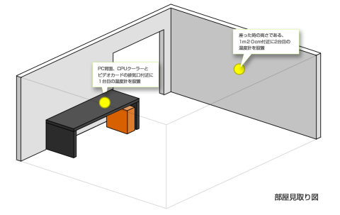 設置場所は、温風を測定するためにPCのCPUクーラー直後の場所と、部屋の壁の2カ所としました。
