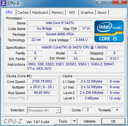 Core i5-3427Uは2コア/4スレッドでクロックは定格1.8GHz(TB時2.8GHz)。Core i3シリーズと比較してコアとスレッド数自体は変りませんがTBが実装されているので最大2.8GHzで動作します。