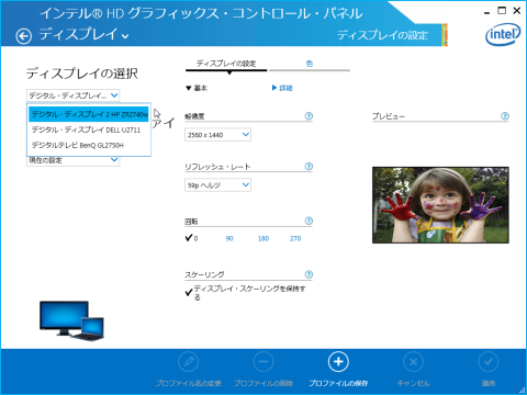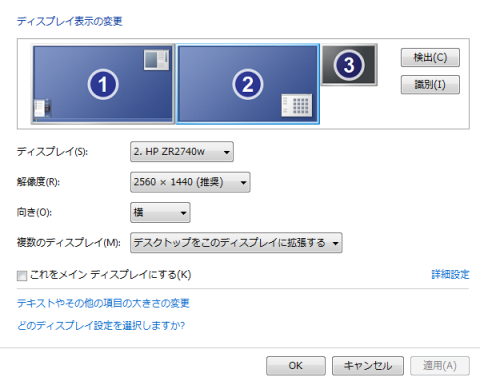 DELL U2711の解像度変更は無理のようなので発想を切り替えて”Intelグラフィックプロパティ”からモニターの順番を(1)HP ZR2740w、(2)DELL U2711、(3)BenQ GL2750HMに変更してみたところ、HP ZR2740wの解像度は2560x1440ドットに変更可能でした。