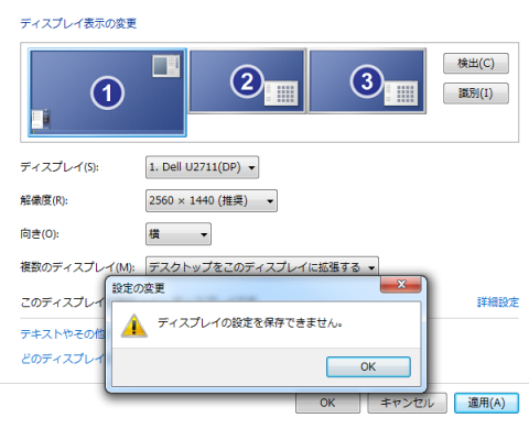 1台目のDELL U2711の解像度が強制的に800x600ドットに変更されてしまい、画面の解像度設定で他の解像度に設定して適応しようとしても「ディスプレイの設定を保存できません。」と謎のエラーが発生して800x600ドット以外の解像度に変更することが不可能という状態です。