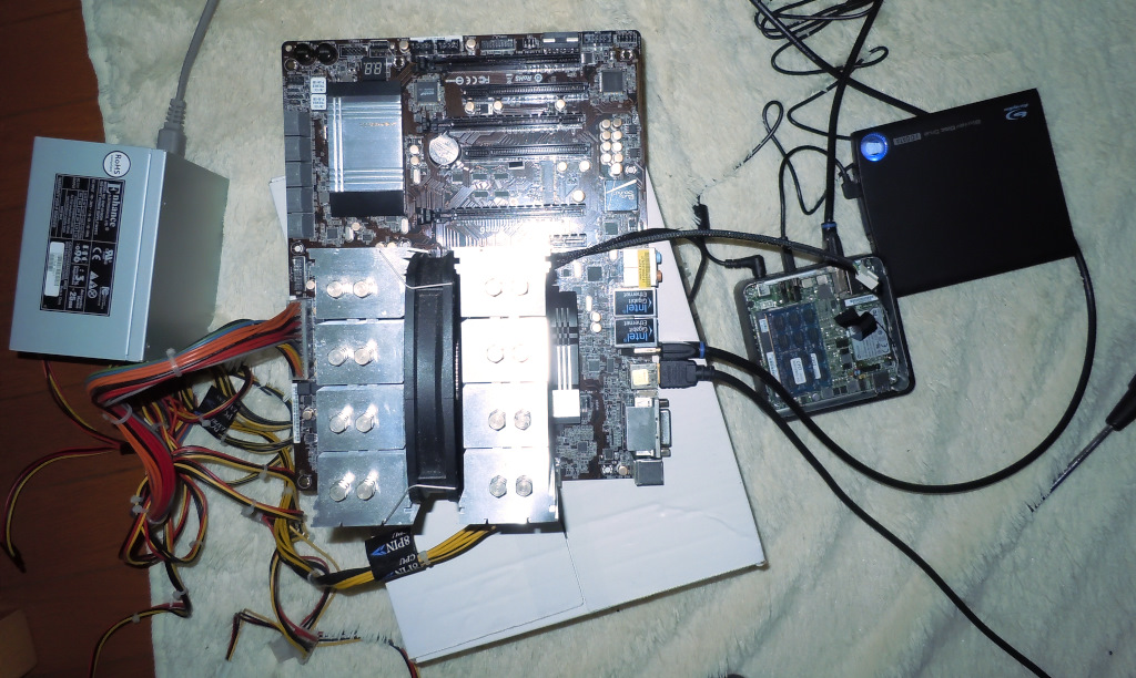 仕方ないので、メインPC候補にCPU、メモリ、電源を供給して、NUCを接続してみました。