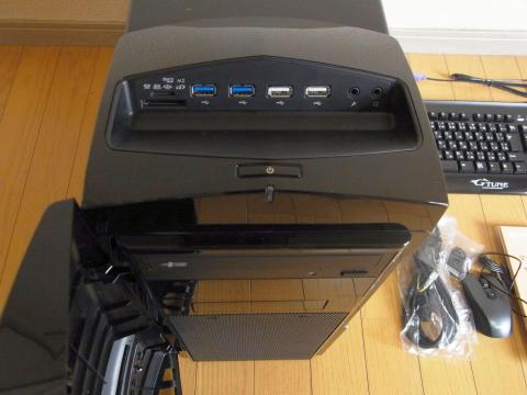 上部にはカードリーダー、USB3.0端子x2、USB2.0端子x2、オーディオ端子があります。すぐ使えるようになっているのは良い感じです。電源ボタンも見えますね。