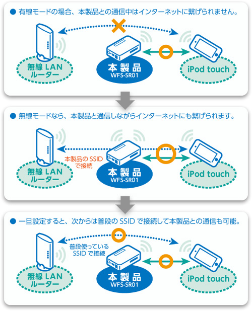 「使い方を見出した」という表現だと『Wi-Fiストレージ』が3つを合体した時に偶然生まれた付加価値というイメージを受けなくもないですが、おそらく本当のところはその逆で、Wi-Fiストレージを実現するために開発された製品と考えたほうが自然でしょう。