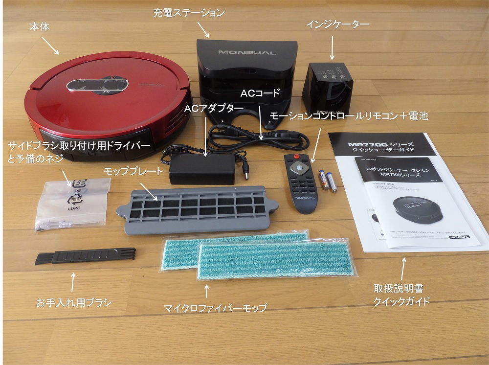 付属品 : 充電ステーション、バッテリー(本体に付属)、ACアダプター、ACコード、インジケーター、モーションコントロールリモコン+電池、サイドブラシ取り付け用ドライバーと予備のネジ、モッププレート、マイクロファイバーモップ(2枚)、お手入れ用ブラシ、取扱説明書、クイックガイド