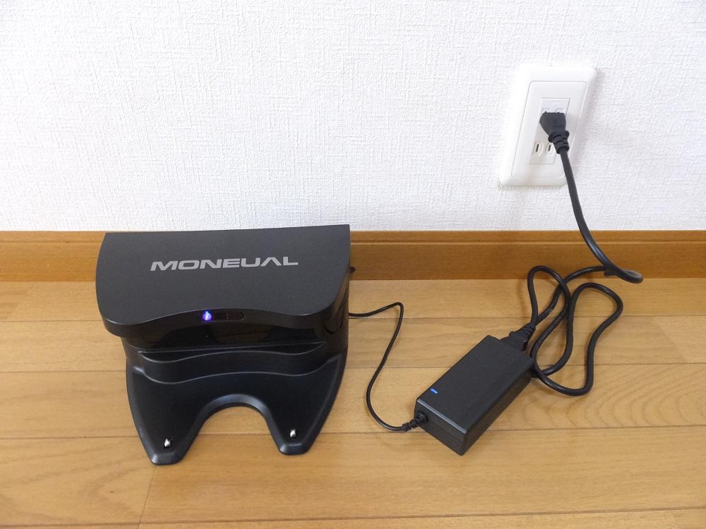 「クレモン」の電源スイッチを入れ、本体を両手で持って充電ステーションに接続し、充電する。