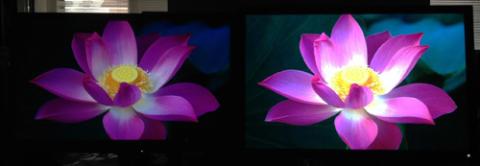 どちらも調整無しの標準の状態ですが、従来品は青味が強く、本製品はそれよりも低い色温度設定となっていています。同じ照度なら色温度が高い(青味が強い)方が明るく見えると言われていますが、今回は見るからに本製品のほうが明るく見えますので、測るまでもなく本製品のほうが明るいです。