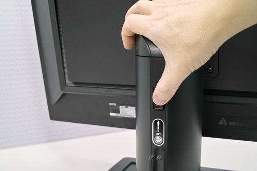 取扱説明書にも書かれていますが、高さ調整で最も下げた状態から高くする場合は、背面側アーム部の「高さ調節用つまみ」を押してロックを解除します。ただし、押しただけではロックが外れないことが多いので、本体を上から下に押し下げながら高さ調節用つまみを押すと簡単に操作できます。