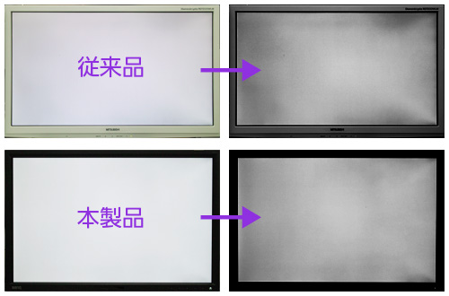 斜め横から見ると本製品(手前)も若干暗く白かぶりしますが、従来品は…