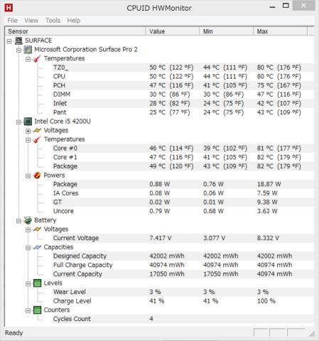 さすがに、CPU温度が80℃を超える状況では、Surface Pro 2本体左上から冷却ファンの音がはっきり聞こえましたが、排熱能力に優れたハードウェア設計なのか、とても薄いタブレットに80℃を超えるCPUが入っているとは思えないほどの本体温度でした。