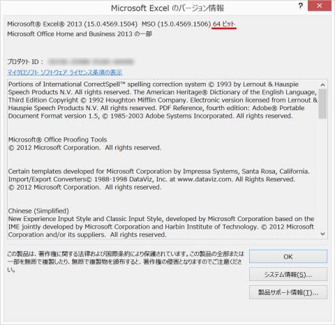 Microsoft Office Home and Business 2013のセットアップを終了し、バージョン情報を見てみると、32bit版がセットアップされていました。