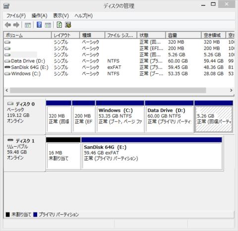 ディスクの管理では、5.26GBの容量が回復パーテーションに割り当てられています。