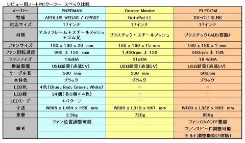 比較対象のノートPCクーラーは,CoolerMaster製の"NotePal L1"とELECOM製の"SX-CL10LBK"です.どちらも17インチまで対応しています.