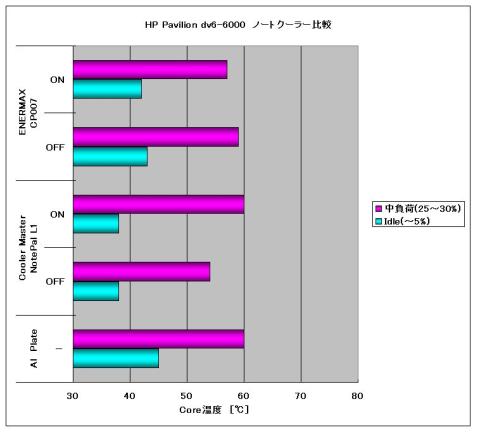 Studio1557とdv6-6000を各ノートPCクーラーの中央に載せて,CPU温度の比較を行います.DELLノートは,低負荷(FLAC再生:5~10%程度)と中負荷(Full-HD動画再生:25~30%程度),HPノートPCは,アイドル状態と中負荷(Full-HD動画再生:50%程度)で比較しました.DELLノートは,中負荷まではPCファンの回転があまり上がりませんが,高負荷だとPCファンが最大となり,比較が難しくなるので,中負荷までとしました.