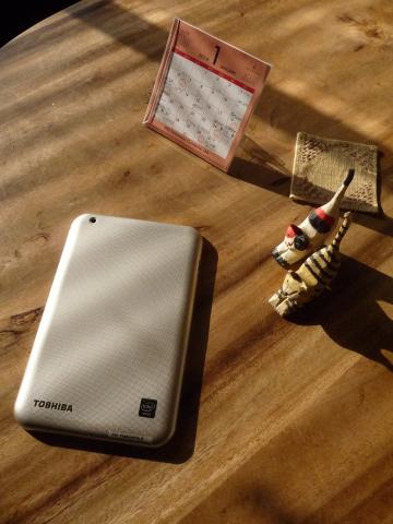 初めて見る8インチのタブレットは実にコンパクト。それでいて、見た目より以外と持ち重りがします。表から見えるアルミのフチの太さの具合が良いバランスです。