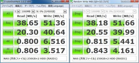 HDDを2台接続して、使用可能なRAID構成のベンチマークテストを実施した結果です。
