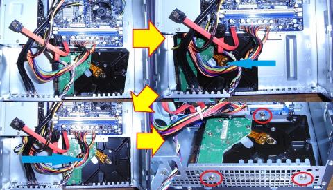 SATAの電源ケーブルを固定しているタイラップを切り、