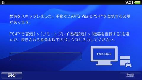 システムバージョン 1.70よりインターネット経由でリモートプレイの機器登録が出来るようになり、この場合数字を入力する事無く接続できます。