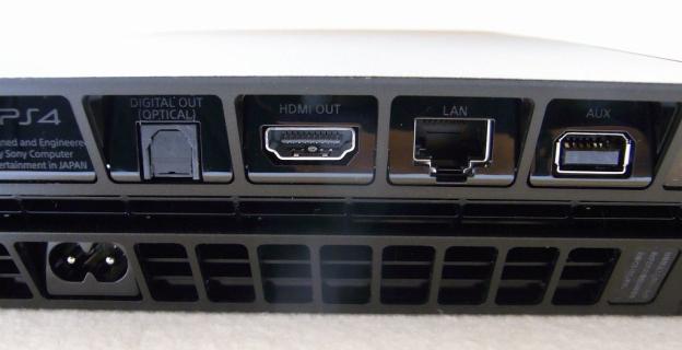 上段左から、光角形のデジタルサウンド出力端子、HDMI端子、1000BASE-T LAN端子、AUX端子。AUX端子は、別売りのPlayStation Cameraで用いる。