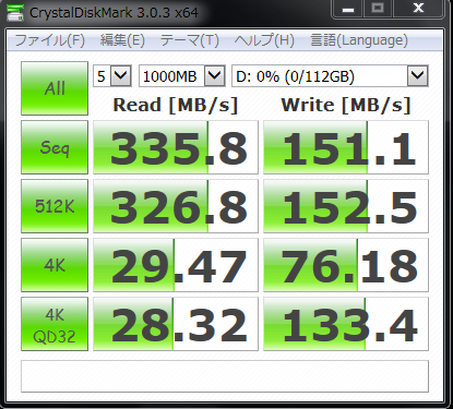 Seqと512Kが約100MB/sほど、4Kと4KQD32がきれい