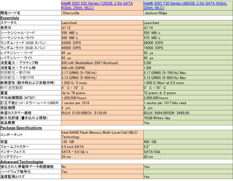 これはIntel SSD 730の英語版のスペック表です。先ほど紹介したIntel 520との比較表には書いていなかった項目も細かく書いてありますので・・・。