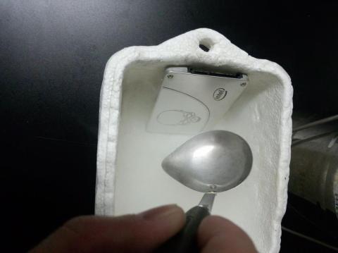 今回はこういう形でSSDを発泡スチロールの箱に入れ、その上から液体窒素を流します。