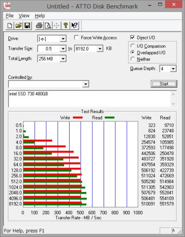 SSD730は、Readで552MB/s、Writeでも510MB/sといずれも公称値よりも高い値を叩き出しています。