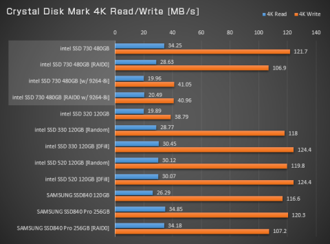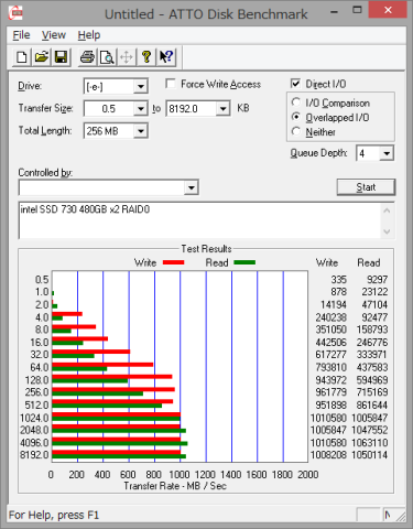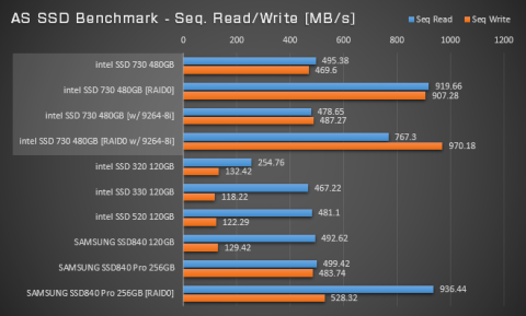 今回は2台でのレビューとなりますので、SSD730単体のほか、2台でのRAID0構成と、もとがエンタープライズ向けのSSDということもあり、MegaRAID SAS 9264-8iでのベンチマーク結果も測定しています。
