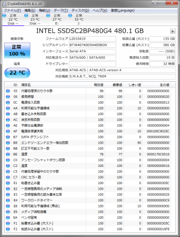 実験を終了した状態でCrystal Disk Infoを確認してみると…見事にエラーが無いことを確認しました。