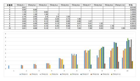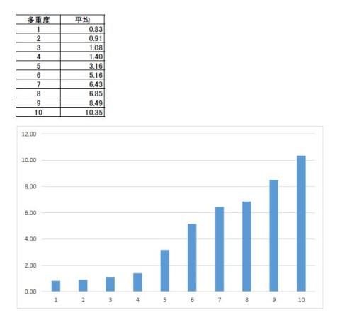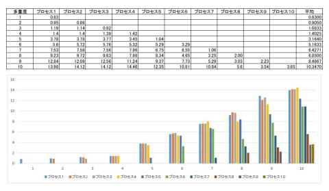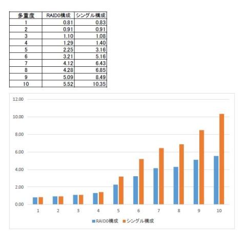 ディスクの多重度について調べて見ましたが、上記のグラフから4多重まではRAID0構成、シングル構成とあまり差がなりません。