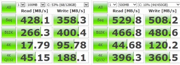 理論値がRead:540MB/sでWrite:520MB/sな事を思うと非常に優秀です。