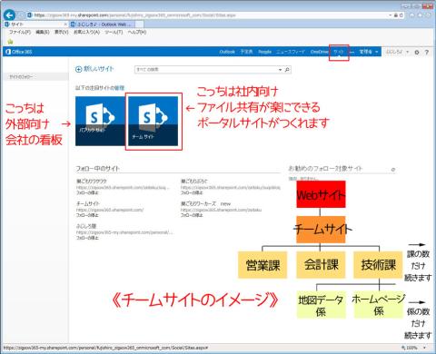 共有をかけたOneDrive上にデータを入れてもらってもいいのですが、複数人でデータをシェアしたり、プロジェクトごとにデータを情報共有するときは、SharePointでチームサイトを作ると便利です。SharePoint Onlineは、ファイル共有や、予定表管理、社内向けポータルサイト、外部向けWebサイトの総合構築や管理などが行えるアプリケーションです。