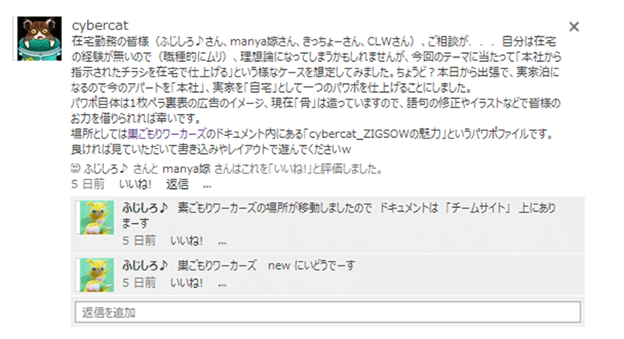 cybercatさんがパワーポイントで広告を作成されていて、メンバー内で校正をお願いされていたときのコメントなんですが、クラウドで全部が繋がっているから、校正をオンラインでできちゃうってことなんですよね。
