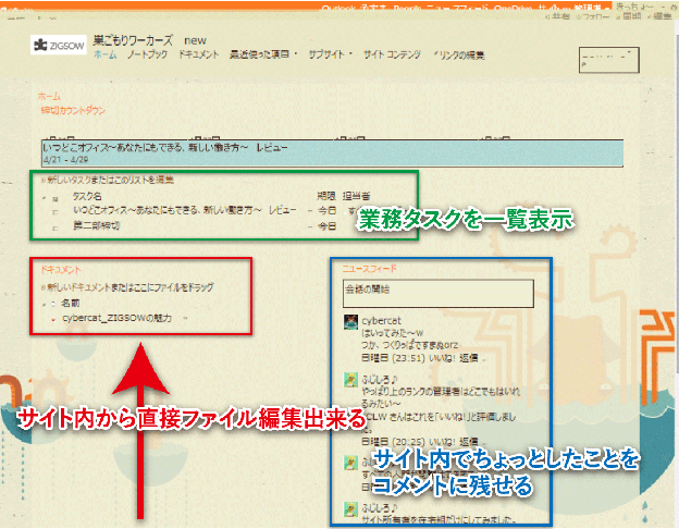 そして、このSNS機能のすごいところはまだまだあるんです。オフィスがクラウド技術に対応していて同時編集できるので、ちょっとした資料作成を同僚に校正のお願いができたり、急ぎの仕事をみんなでワーーッ!と一斉に掛かれてしまえる。