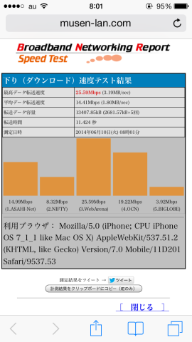 もともとこの周囲は電波の入りが悪いのが、遅いと感じられます。