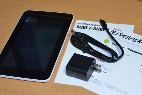 パッケージには、CLIDE7本体、取扱説明書、ACアダプタ(USB充電対応)、USBケーブル、McAFEE モバイルセキュリティーが入っています。