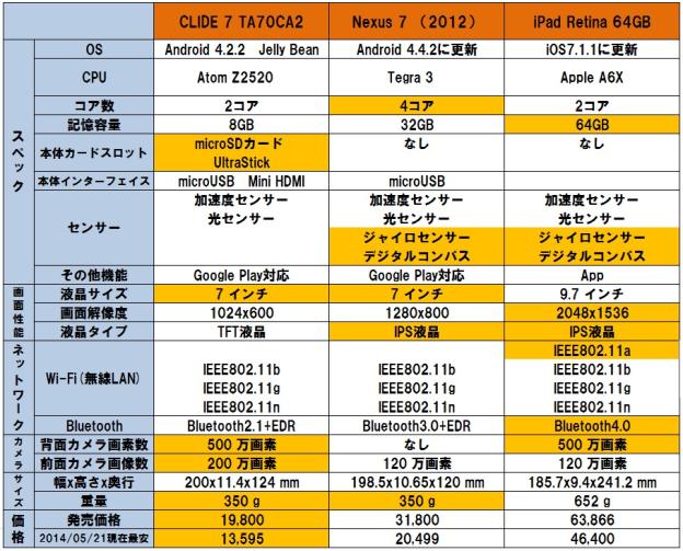 ●2014/05/25 追記 「CLIDE 7」とその他のタブレットとの比較