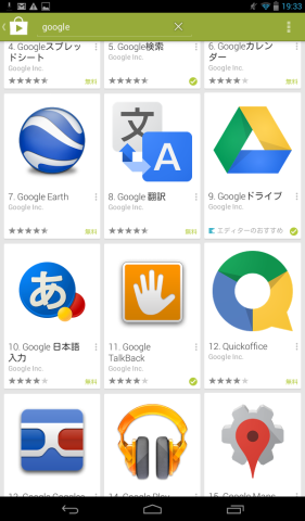 右上の検索アイコンをクリックして「google」で検索すればgoogleに関係したアプリの一覧が現れるので、「google日本語入力」を選択してインストール。インストール後は初期セットアップを表示される手順に沿って済ませます。
