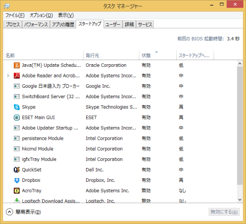 「スタートアップ」も、これまでは msconfig から弄る必要があったものが、ここに移動しています。ついでに BIOS 起動時間も出ていたりと高機能に。
