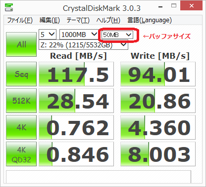 バッファサイズ50MBにすると良い値がでました。