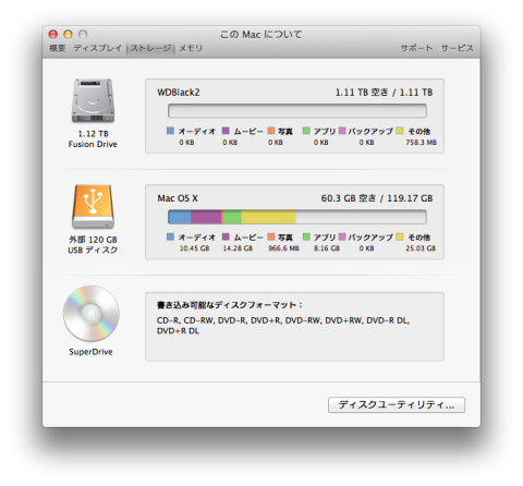 ストレージ一覧をチェックして、WD Black²の部分がFusion Driveとなっていれば、