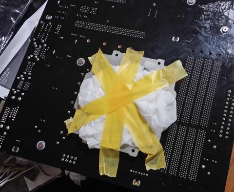 接点が水滴でショートしないように、使用しないFAN端子や、メモリスロットをマスキングテープで塞ぎ、水滴が溜まりそうな部分にティッシュを押し込んでおきます。