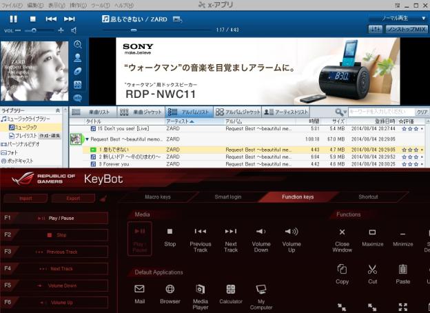 Xアプリでアルバムは聴いているので、Xアプリ用に一時停止/停止/早送り/戻し/ボリュームなどのキーとして、実際にF1~F6まで登録してみました。