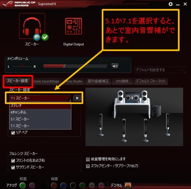 5.1または7.1スピーカーを選択したら、室内音響補正で更に細かく設定ができます。