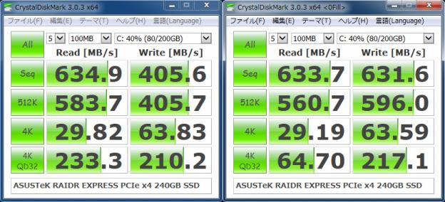 今回の比較対象となる、PCIe x4接続のSSD ASUSTeK RAIDR EXPRESSのベンチマークデータは、