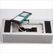 普通のBluetoothスピーカーと違い、低音域専用のサブウーファーが追加されていて、それもスピーカーとは別の独立した専用アンプで駆動されます。 また、内部が別けられていて、スピーカーの音とサブウーファーの音が干渉しないように分離された構造になっています。