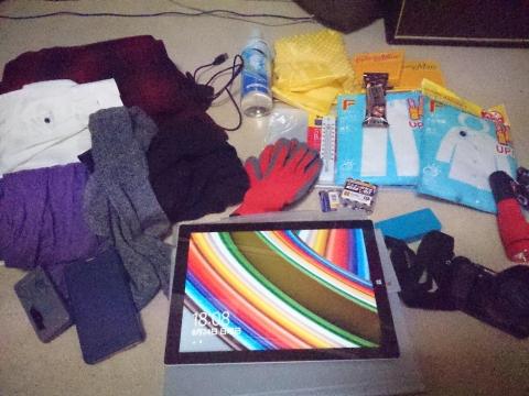 登山準備中の写真です。すこしでも荷物は軽くしたいけど、持っていくものも多いですね。一式をカバンに詰めてみましたが、Surface Pro 3の軽さなら持っていくのは苦にならなそうです。